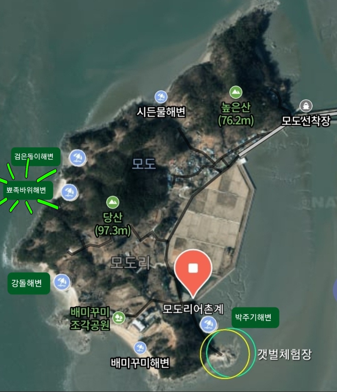 - 수많은 조개껍질로 이루어져 이색적인 해변을 감상할 수 있는 자연해변이다.